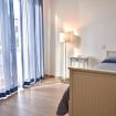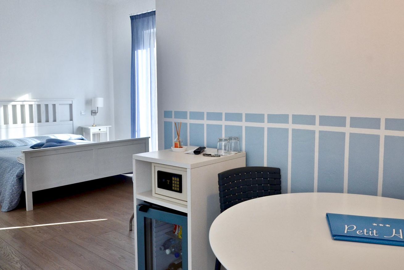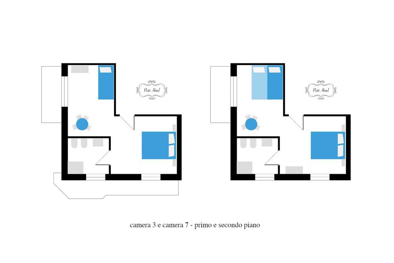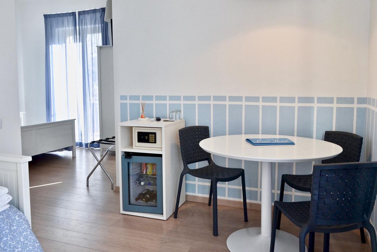 Questa camera è composta di due ambienti collegati ad angolo; è dotata di con un letto matrimoniale, un divano letto con un tavolo rotondo, il bagno con doccia ed un balcone. E' provvista di aria condizionata, tv, wifi libero, cassaforte, frigo bar, asciugacapelli e su richiesta di una culla lettino per bambini piccoli. Le mini suite sono adatte a famiglie di 3 o 4 persone.